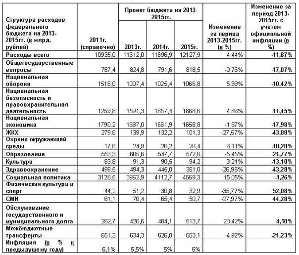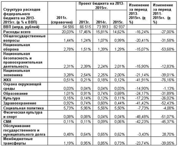 Согласно Закону «О Федеральном бюджете» совокупные расходы федерального бюджета подлежат сокращению с 20% ВВП в 2011г. до 17,4% в 2013г. и 14,6% к 2015г. Это наглядней любой словесной критики характеризует реальное целеполагание и направленность действий российских либеральных «экспертов», консультирующих правительство и администрацию президента. При этом за период с 2011 по 2015гг. с 3,28% до 2% ВВП «модернизированным» правительством подразумевается урезание расходов на финансирование национальной экономики – с 3,28 до 2% ВВП, на ЖКХ - с 0,51% до 0,12%, на образование и науку - с 1,01% до 0,69%, на здравоохранение - с 0,92 до 0,44%, на культуру - с 0,15 до 0,11%, на физическую культуру и спорт - с 0,08% до 0,04%, на СМИ – с 0,11 до 0,06%.