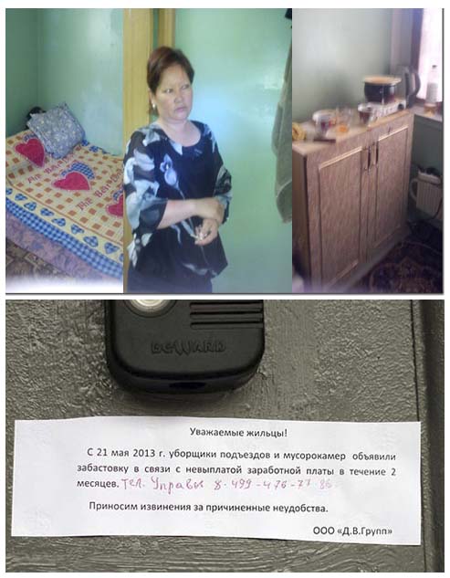 Но дело тут не в ксенофобии, напротив, мне живущих там барышень даже жалко. Во-первых, вряд ли они сильно разбираются в электричестве, а если все время спать на электрических проводах может и жахнуть. А во-вторых,деньги на эту самую уборку выделяются очень хорошие, и я знаю конкретных людей, которые с удовольствием и гораздо лучше делали бы все то, чем сегодня заняты гастарбайтеры из щитовой. Если, конечно, им будут платить по штатному расписанию, а не как гастарбайтерам, которым, понятно, не платят, в чем легко убедиться, посмотрев на картинку снизу. Ее я сняла прямо сегодня тоже в моем же родном СВАО. Как видите, не платят им месяцами, даже забастовку объявили. Вот такие язвы родного собянинского капитализма.