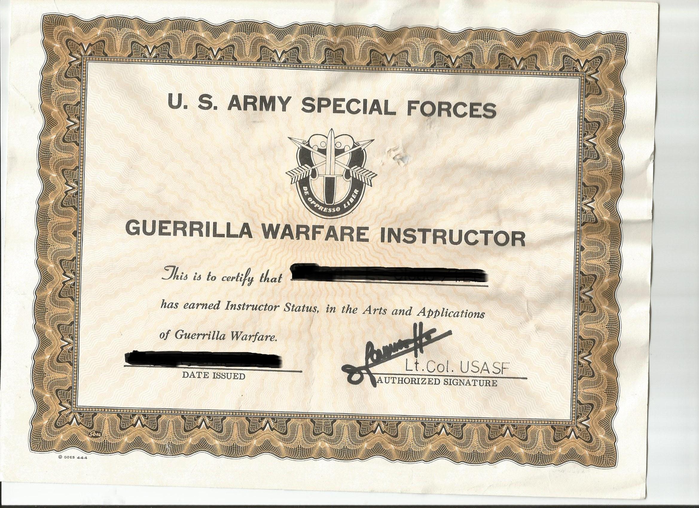 «Спецназ Армии США. Инструктор партизанской войны. Настоящим удостоверяется, что (звание, имя, фамилия) заслужил статус инструктора в области искусств и применений партизанской войны».