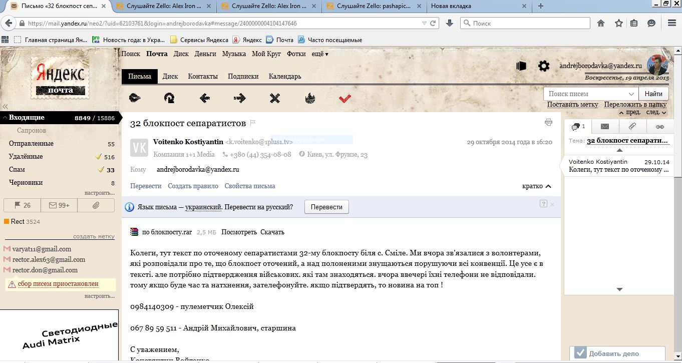 В результате было принято решение ЛЮБЫМ способом проверить указанные выше сведения… То, что вы увидите далее, – результат взлома общеизвестной электронной почты героя Новороссии. Подчеркиваем, что данные действия были произведены заинтересованным лицом из Харькова, и добытые там материалы несколько раз проверялись в Москве…….
