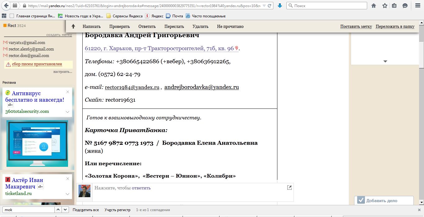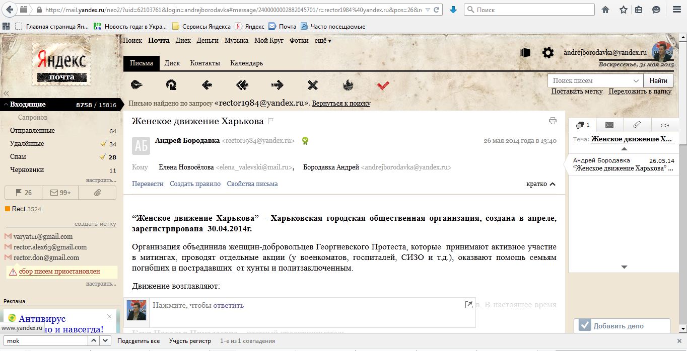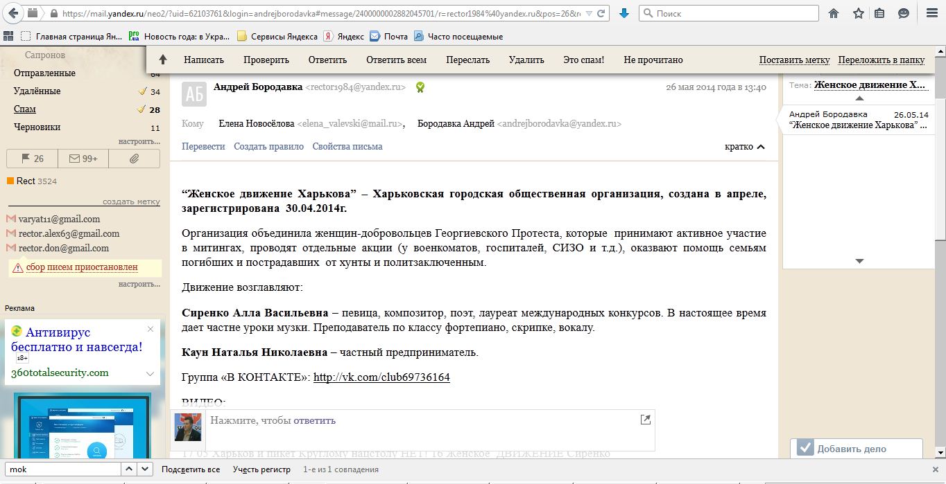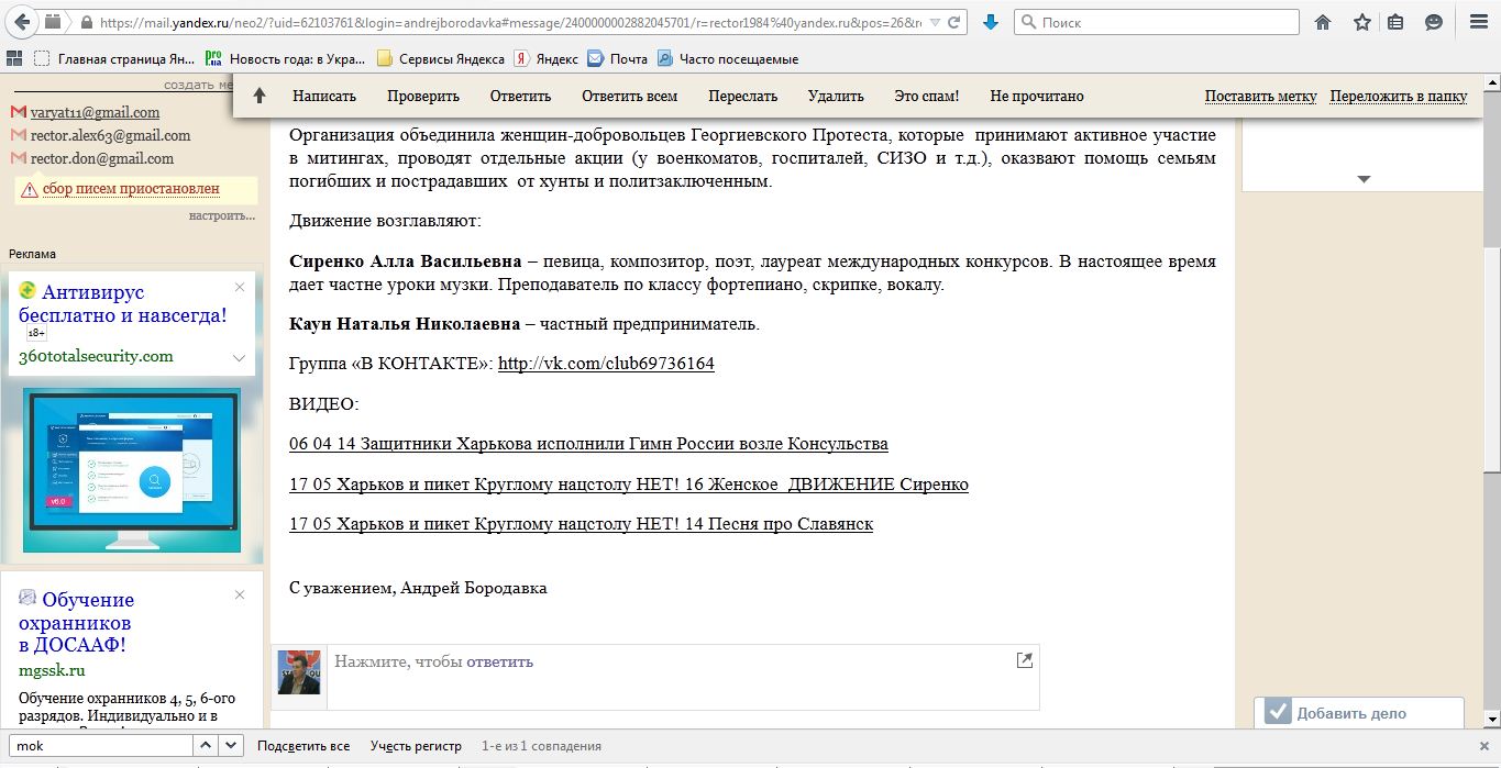Собственно, наше расследование началось с выяснения причин стремления нашего «героя» замыкать любыми способами на себя все финансовые потоки по Антифашистскому движению Харькова. Затем нас крайне встревожила информация от аналитиков из харьковского подполья, что заинтересованность в замыкании всего протестного актива Харьковской области на А. Бородавку «почему-то» проявляют все ветки действующей в указанном регионе власти. Еще более насторожило весеннее сообщение о распространении им неправдивой информации вроде «добровольного возвращения Алчевска в состав Украины», на ура подхваченной всеми укропскими СМИ. В результате было принято решение ЛЮБЫМ способом проверить указанные выше сведения… То, что вы увидите далее, – результат взлома общеизвестной электронной почты «героя» Новороссии. Подчеркиваем, что данные действия были произведены заинтересованным лицом из Харькова, и добытые там материалы несколько раз проверялись в Москве (причем, в том числе в режиме он-лайн по тому адресу, где в таких вопросах не ошибаются).