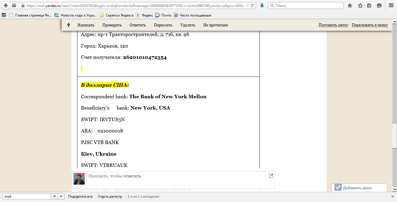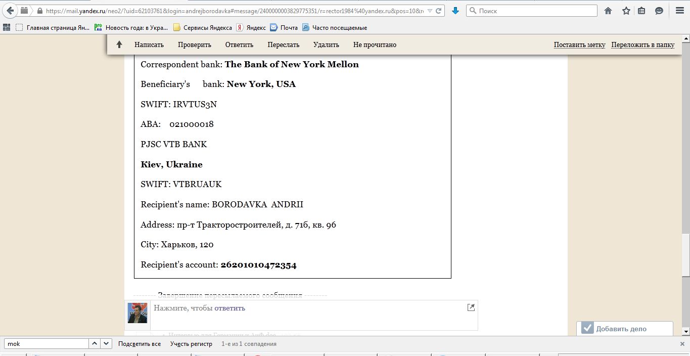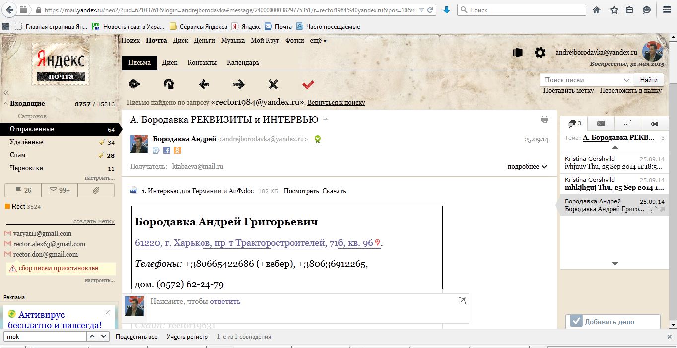 Собственно, наше расследование началось с выяснения причин стремления нашего «героя» замыкать любыми способами на себя все финансовые потоки по Антифашистскому движению Харькова. Затем нас крайне встревожила информация от аналитиков из харьковского подполья, что заинтересованность в замыкании всего протестного актива Харьковской области на А. Бородавку «почему-то» проявляют все ветки действующей в указанном регионе власти. Еще более насторожило весеннее сообщение о распространении им неправдивой информации вроде «добровольного возвращения Алчевска в состав Украины», на ура подхваченной всеми укропскими СМИ. В результате было принято решение ЛЮБЫМ способом проверить указанные выше сведения… То, что вы увидите далее, – результат взлома общеизвестной электронной почты «героя» Новороссии. Подчеркиваем, что данные действия были произведены заинтересованным лицом из Харькова, и добытые там материалы несколько раз проверялись в Москве (причем, в том числе в режиме он-лайн по тому адресу, где в таких вопросах не ошибаются).