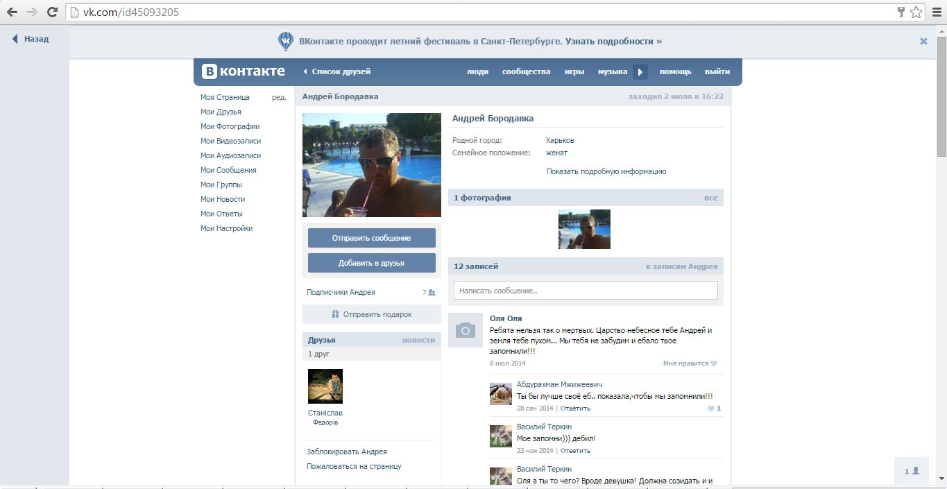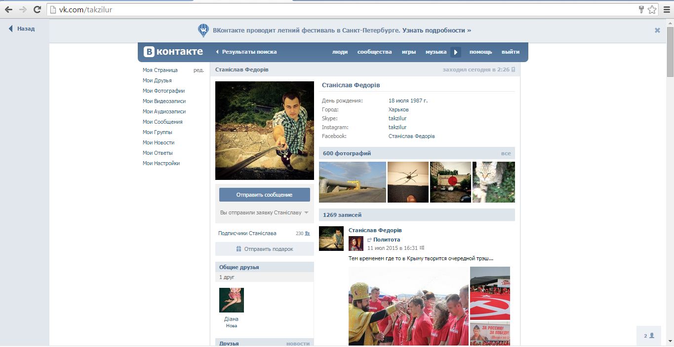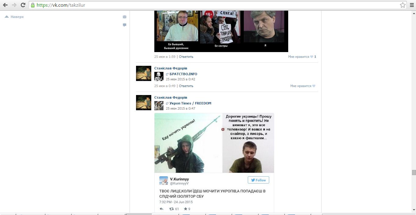 Ответ реального человека. Роман Зинченко: а с чего это «тайная» страничка ВКонтакте? Я ее давно знаю и вижу, она с фотографией Андрея и в поиске по фамилии сразу выскакивает! Мало того, на ней майдауны разместили угрозы Андрею, а эти деятели скрин, как какой то компромат выкладывают. На кого это рассчитано?