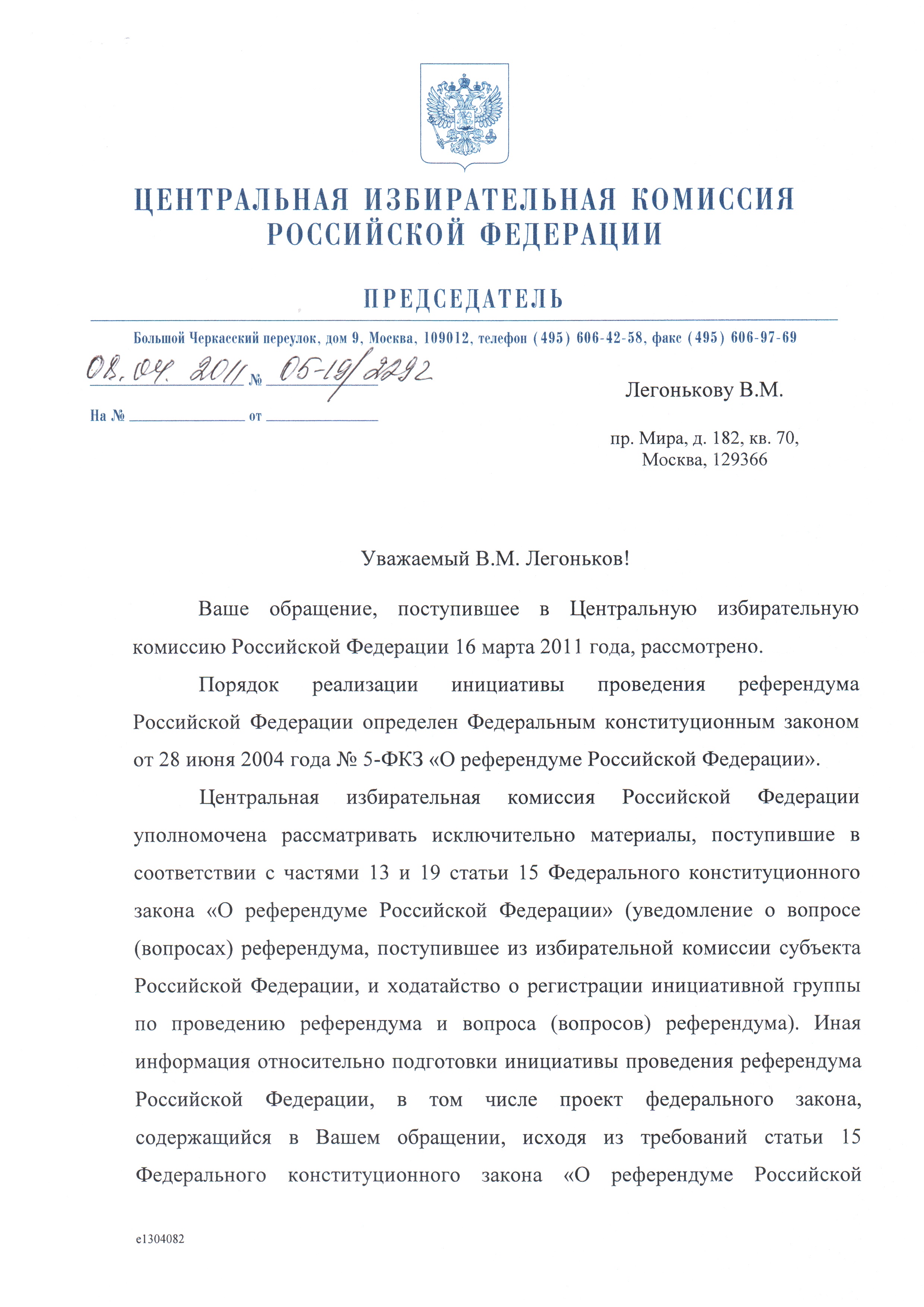 А в приложении я дам письмо в ЦИК, посланное в марте 2011 года, и сканы ответного письма из ЦИК на сообщение о том, что ИГПР ЗОВ начала организацию референдума.