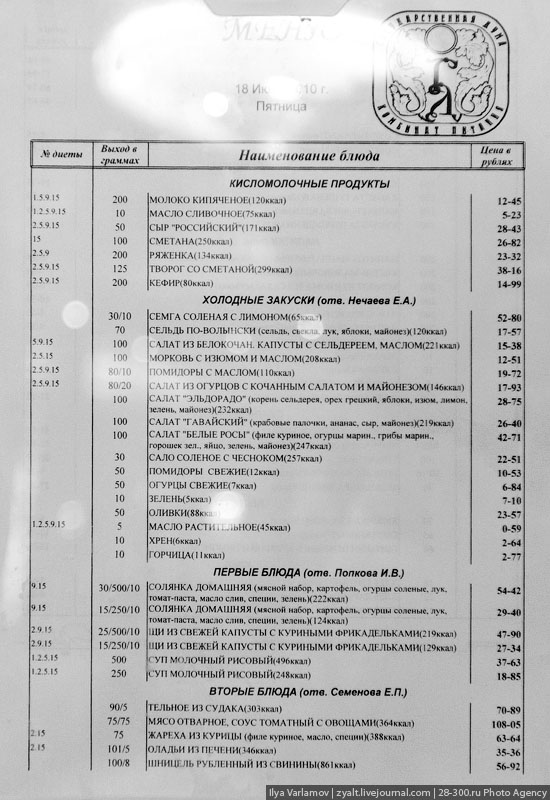 "Странное все-таки место,- пишет в своем ЖЖ zyalt. - Гуляют дети в футболках "Саратовская Губерния" с пакетами "Единая Россия". В думских сувенирных лавках продают золотые монеты с ликами Путина и Медведева. Неожиданно ко мне подошел мужчина в черном пальто и сказал: "Это вы снимали на Триумфальной 31? Да, да, вы! Я вас запомнил! Приходите обязательно в следующий раз! Нас будет много, потому что за*бали!" - и быстро ушел. В по коридорам ходят какие-то странные женщины с большими прическами, в "столе заказов" (это там где можно икры и колбаски недорого заказать) очередь. Под катом картина, которая висит в логове ЛДПР и меню думской столовой, где оказалось нельзя снимать. Особенно стоит отметить хамство охраны, им надо не Думу охранять, а рабов на плантации".