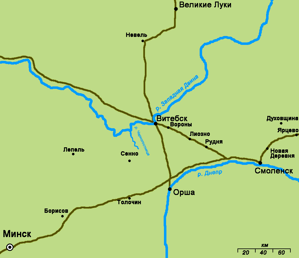 На начало дня 14 июля мотострелковый полк и второй дивизион продолжают бои за Витебск: «14 ГАП в районе Вороны уничтожил 3 танка, мотоциклетную роту и 200 чел. пехоты». Возможно, сегодня на карте уже нет тех населенных пунктов, что были тогда, и трудно оценить, где на самом деле были танки под командой командира дивизии полковника Васильева, во всяком случае, как это можно понять, они вели бои уже южнее Витебска.