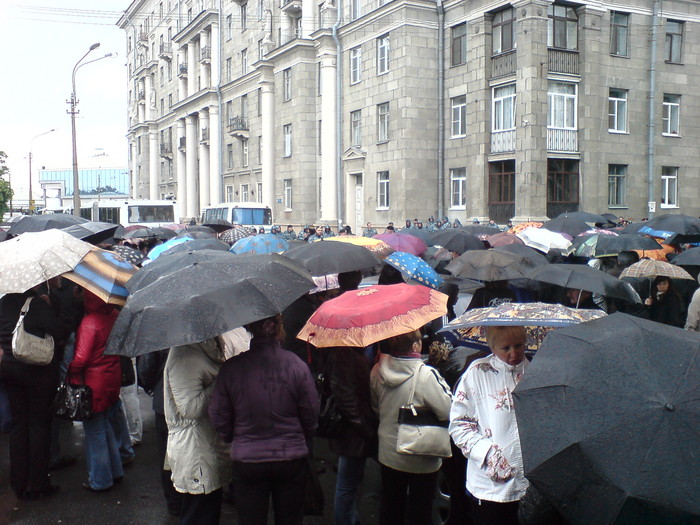 Когда я подъехал к Ленэкспо, там уже было около 500 человек. На Форум, есесно, не пускали - стояли ограждения и оцепления из ментов и омоновцев. Из-за плохой погоды (холод, дождь и промозглый ветер) предприниматели прятались под зонтами, деревьями, балконами и навесами соседних домов, но не расходились. Постепенно подъезжали еще люди, из других «горячих точек» малого бизнеса.