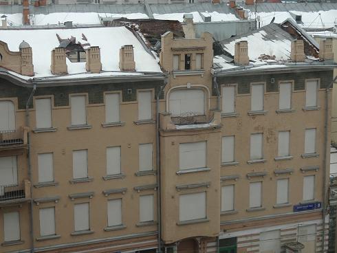 После пожара, который тушили без особого усердия – крышу не стали ремонтировать, а оставили догнивать – всем осадкам настежь распахнутой теми самыми дырами, через которые дом тушили сверху, заливали, «проливали». Вот так при Собянине берегли исторический дом, московский модерн…