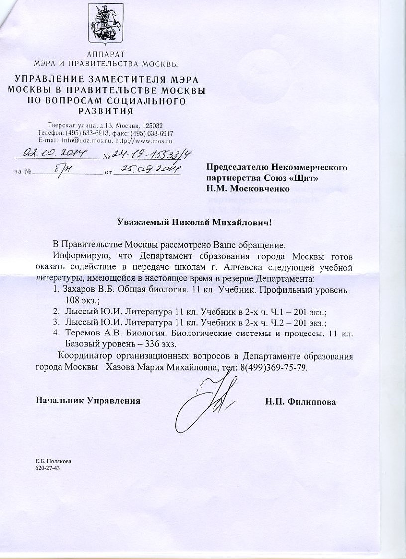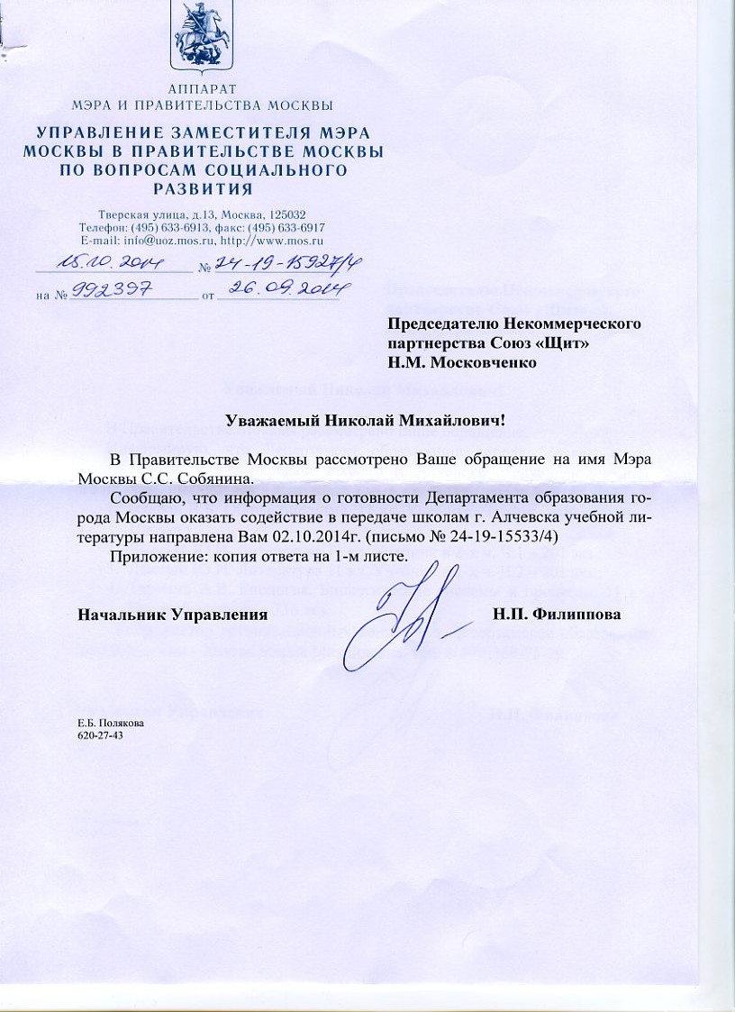 Спустя примерно 2 недели мы получили ответ из Администрации, что наш вопрос направлен по подведомственности - в Департамент образования Москвы. Это нас несколько удивило - к тому времени мы уже узнали, что такой "политический" вопрос как учебники для Новороссии рассматривался на весьма высоком уровне на Старой площади, и решения все никак не могли принять. А тут - департамент столичного правительства, чья компетенция в данном случае - это исполнить, а не принять решение.