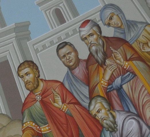 Вот только протоиерей забыл добавить, что традиция эта - средневековая, из тех времен, когда князья и короли собирали останки разных святых и хвастались друг перед другом, у кого таких "священных реликвий" больше. Иногда даже воевали между собой за голову какого-нибудь почитаемого мученика, не особо даже вдаваясь в подробности того, что еще несколько голов этого святого могли находиться в других местах. Вот примерно из тех времен и традиция рисовать князей на иконах в образе разных почитаемых личностей, а иногда и просто так.