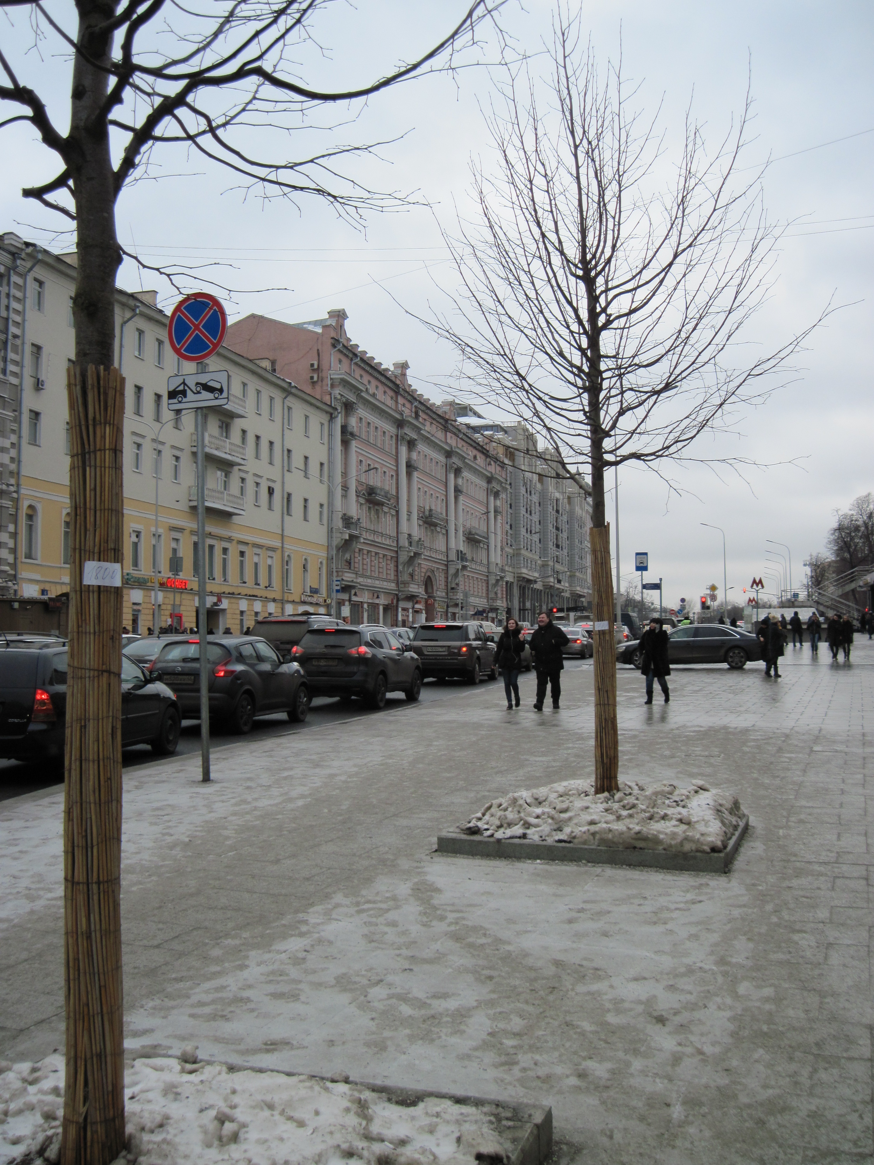 В сравнении - ориентируйтесь на фонари (на которых самые угарные наши братья-оппозиционеры собирались вешать либеральную контру), они-то с советских времён не менялись.  Теперь задаю главный вопрос: зачем тыкать деревья в асфальт, где они не приживутся, если рядом есть достаточно широкая полоска земли, где они вообще-то и росли прекрасно, пока их не выморил Лужков своими реагентами? Да, теперь тут растут одни автомобили и за ними недовысотка Сбербанка от "Донстроя" - ни кустика. Но ведь можно всё исправить...