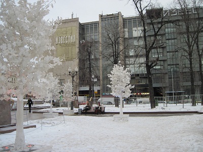 Вот, например, явная конкуренция выражению «торчат, как три тополя на Плющихе» - хоть два, но зато в таком месте, где деревья не росли уже лет сто пятьдесят. Хотя исторически это место и имеет название «Нарышкинский сквер», но сам по себе сквер-то был давно присоединён к Страстному бульвару. А тут вот, видимо, чтобы показуха перед Федеральным агентством печати была именно показухой, - имеем теперь зримое воплощение ещё одного ностальгического заголовка из восьмидесятых (только красовался он чуть далее, на огромной стенной афише кинотеатра «Россия») - «И на камнях растут деревья».