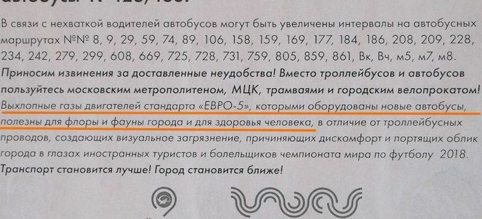 "Выхлопные газы двигателей внутреннего сгорания стандарта "Евро-5", которыми оборудованы новые автобусы полезны для флоры и фауны города и для здоровья человека, в отличии от троллейбусных проводов, создающих визуальное загрязнение, причиняющих дискомфорт и портящих облик города в глазах иностранных туристов и болельщиков чемпионата мира по футболу 2018", - говорится в сообщении мэрии Москвы, развешанных на остановках общественного транспорта столицы.