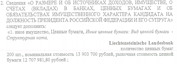 Но мне вот не очень понятно еще кое что - куда девались эти ценные бумаги со счетов в банке Лихтенштейна? У этих бумаг очень много достоинств, и как говорят специалисты, по их набору можно судить о хорошем вкусе П.Н.Грудинина к финансовым инструментам. Но у них есть один существенный недостаток - они очень низко ликвидны! Да и понятно, в основном это инструмент консервативного накопления, сроки погашения колоссальные, до 30 лет - их владельцам обычно нет нужды суетиться. Редко какому владельцу офшорного счета приходит фантазия срочно баллотироваться в президенты, чтоб в декабре открыть счета на колоссальную сумму, а уже после Нового года спешно их начать ликвидировать.