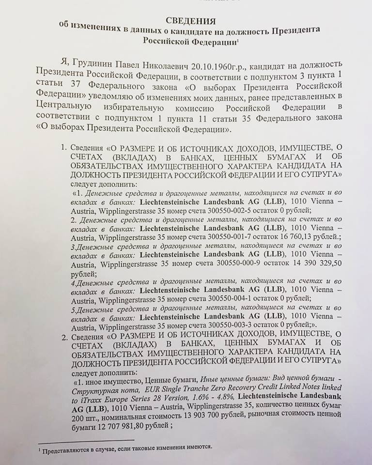 Ранее член Центризбиркома Борис Эбзеев сообщил в ходе заседания комиссии, что Грудинин при подаче документов для выдвижения указал, что имеет пять счетов в одном из банков в Вене. При этом другой член ЦИК - Евгений Колюшин - уточнил, что все счета были закрыты до регистрации кандидата.