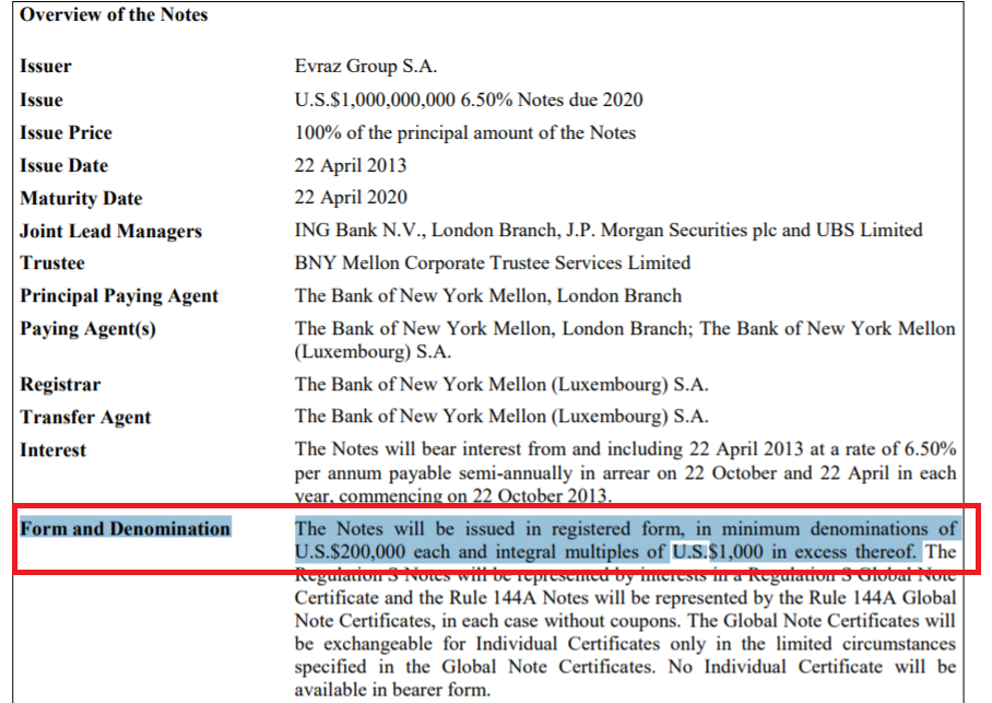 То есть в соответствии с эмиссионными документами данного выпуска еврооблигаций (нот) Евраза, одна ценная бумага (одна нота) может иметь минимальный номинал в 200 000 долларов США и больше - 201 000 долларов США, 202 000 долларов США и так далее.