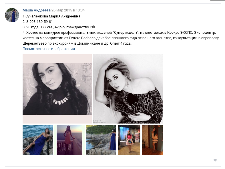 Еще в 2015 году Сучеленкова Мария Андреевна искала работу промо-модели и оставляла свои контактные данные (мобильный номер до сих пор действующий) в соответствующих тема в социальной сети ВКонтакте: