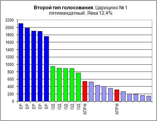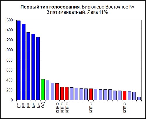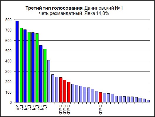 Но уже голосование третьего типа (Даниловский № 1) демонстрирует приблизительное равенство административного и оппозиционного довесков. В итоге ЕР и ОД разделили мандаты пополам.