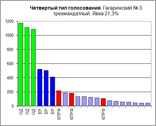 Наконец, четвертый тип голосования (Гагаринский № 3) демонстрирует уже подавляющее превосходство оппозиционной мобилизации над административной.