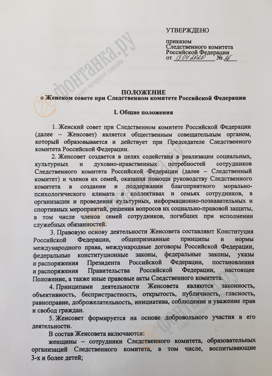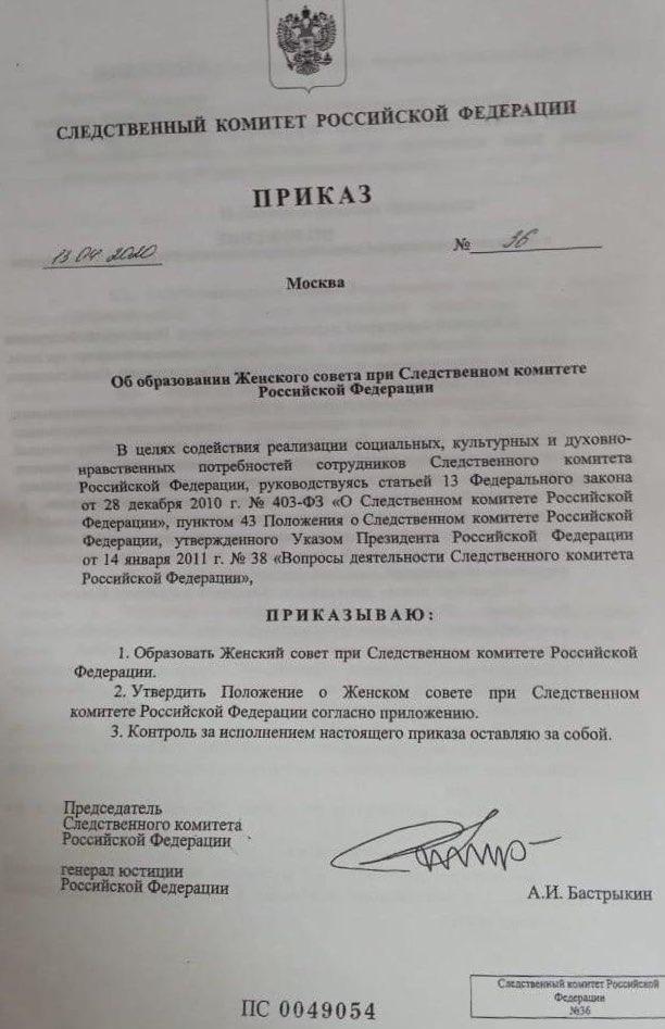 Вот именно так, в полный рост. В официальном документе прямо написано: "Деятельность членов Женского совета будет основываться на общественных началах. В его состав войдут женщины из числа сотрудников (...) Членами совета могут также стать иные женщины, оказывающие содействие Следственному комитету".