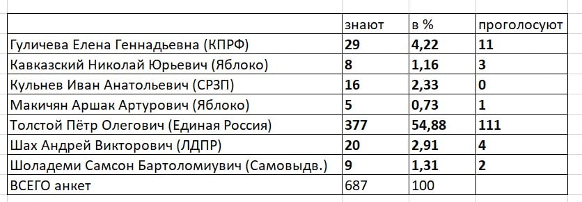 «Итак, наш социологический проект продолжается, хотя и со скрипом, - пишет автор и главный исполнитель проекта Петр Милосердов. - На днях прозвонили 199-й округ, сейчас взялись за 201-й. Результаты на табличке.