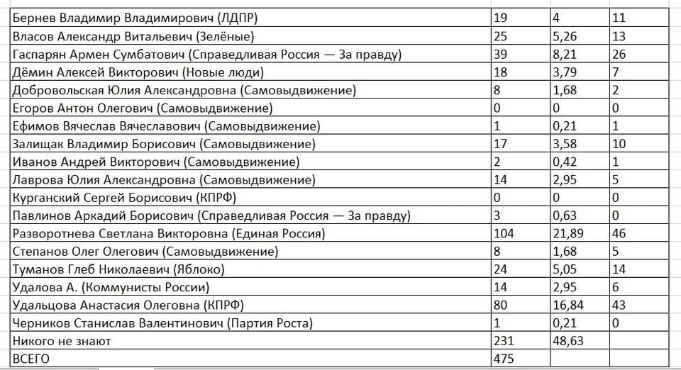 Следует обратить внимание на кандидата А.Удалову от Коммунистов России – почти 3 процента. Явный кандидат-двойник для Удальцовой, но имеет своего потенциального избирателя, и навряд ли это просто так люди перепутали.