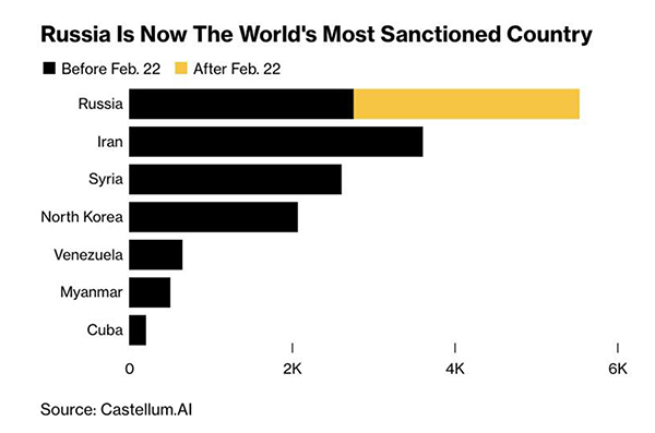 Россия стала страной, против которой за несколько лет было введено больше всего санкций, а с 22 февраля добавилось еще 2778 новых ограничительных мер, сообщает сервис слежения за санкциями Castellum.AI.