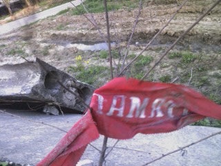 От монумента остался небольшой пятачок, примерно три на три метра, когда-то бывший забетонированным подножием и небольшой площадкой. А в канаве, на обочине - остатки самого сооружения. В грязи я увидал клочок красной тряпицы, похожей на пионерский галстук. Потянул - оказалась лента с остатками слова «память». Слегка расправил, получилось символично.