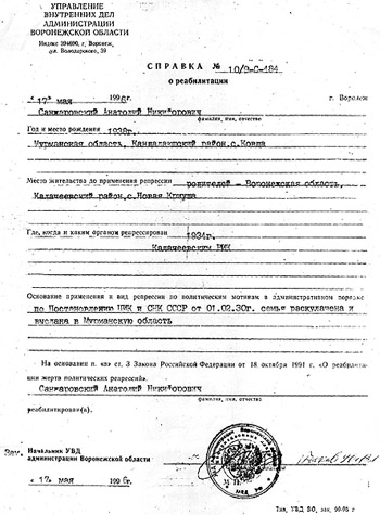 "Реабилитирован и я. Являюсь членом Московской ассоциации жертв незаконных репрессий. Читаю в моей справке о реабилитации: