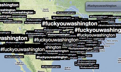 Компания #fuckyouwashington, начатая в субботу вечером, достигла максимума позже той же ночью, затем спад и снова подъём в воскресенье днем - по-видимому, потому что в газетах появились заметки об этом или, возможно, в результате сообщений в воскресных программах новостей. И она всё ещё жива, хотя и сократилась до нескольких твитов в минуту. (Тема не стала доминирующей на Твиттере, очевидно потому что на сайте осуществляется модерация тем)