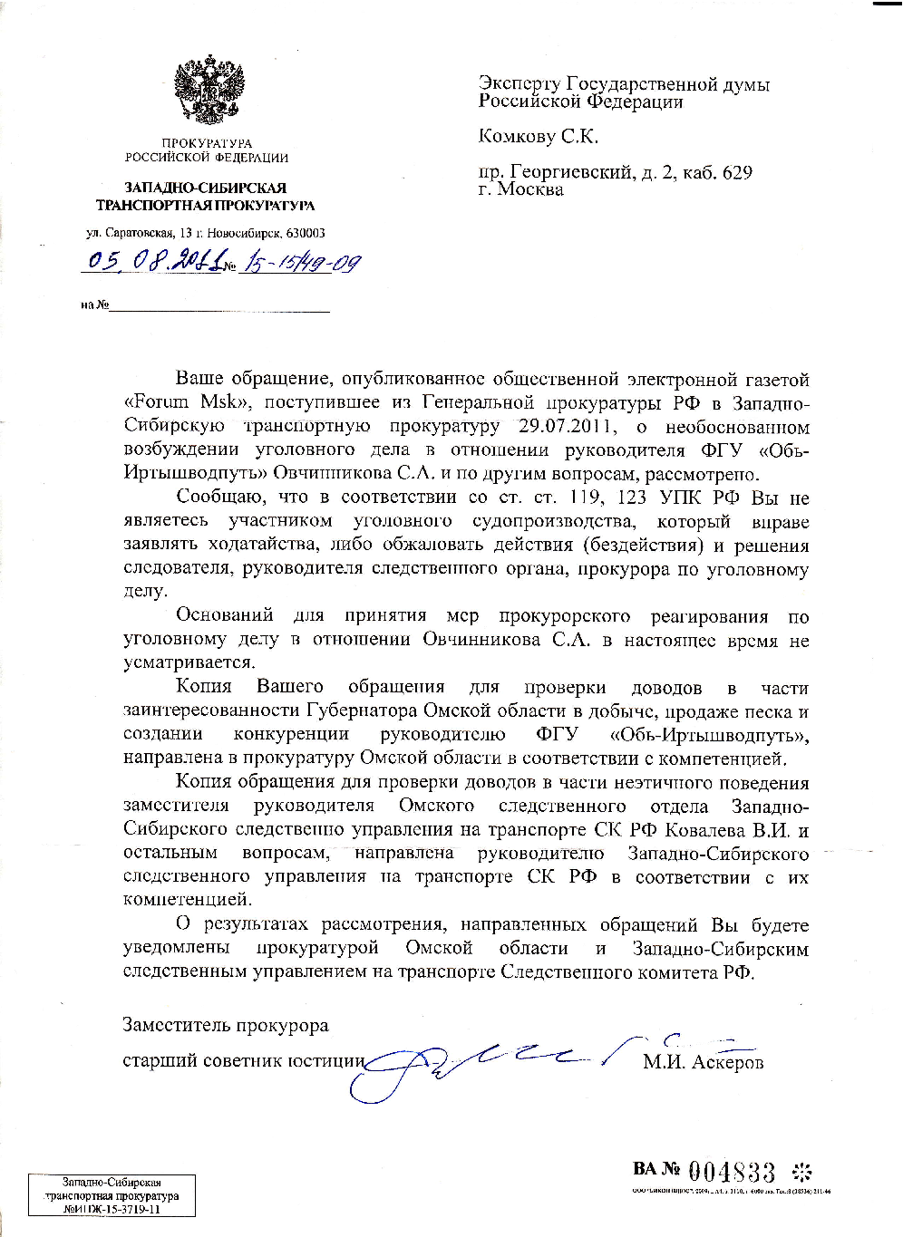 Более того, Сергею Комкову ответили не только из Генпрокуратуры, но и из Западно-Сибирской транспортной прокуратуры:
