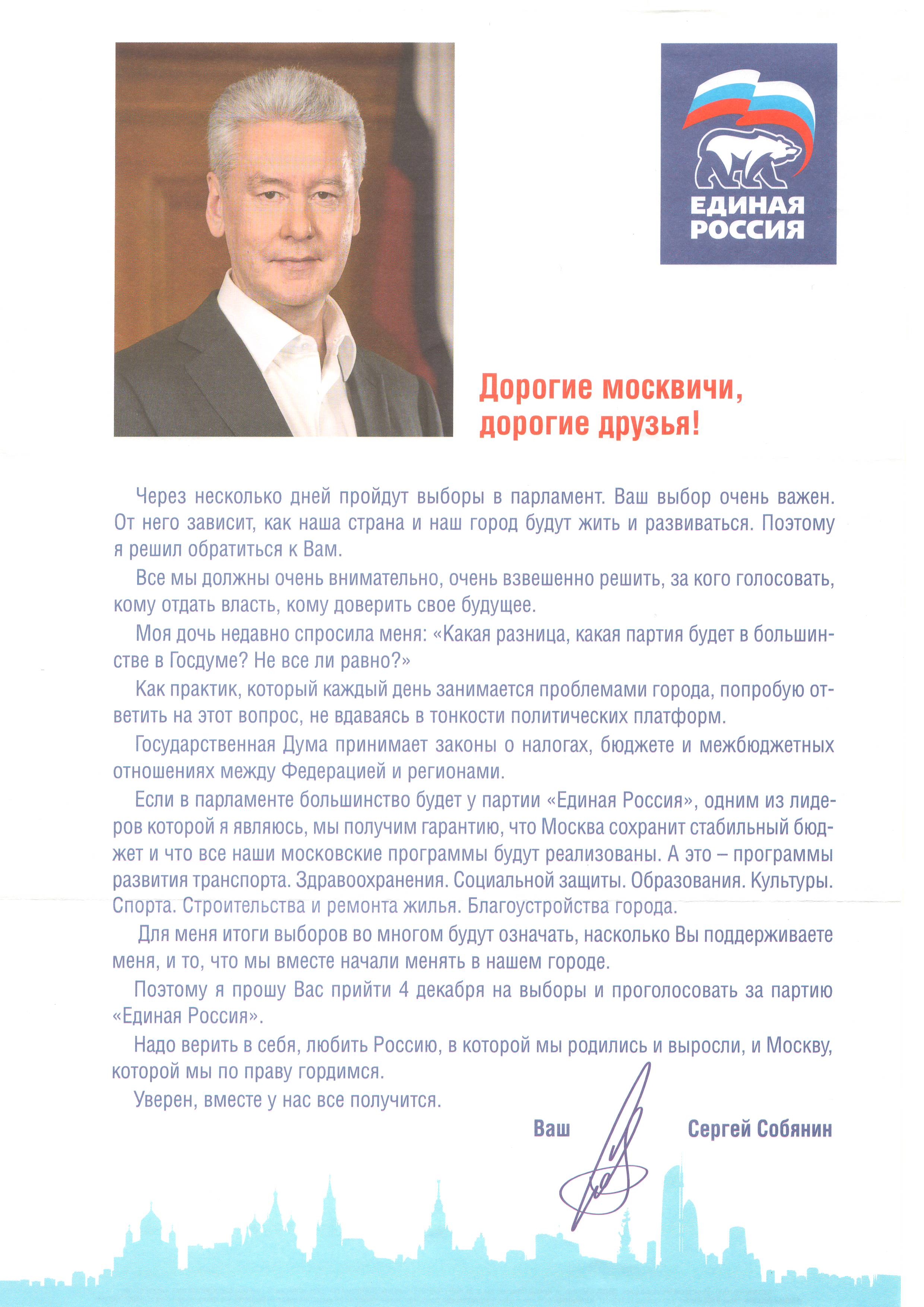 То есть "Ваш Сергей Собянин" (из письма) обращается как обычный гражданин к 3,5 миллионам своих "дорогих друзей", которых просит его поддержать. Странно, как можно за год проживания в Москве подружиться с таким количеством людей, и каков авторитет у Собянина, как гражданина, а не Мэра, перед "Дорогими москвичами"?