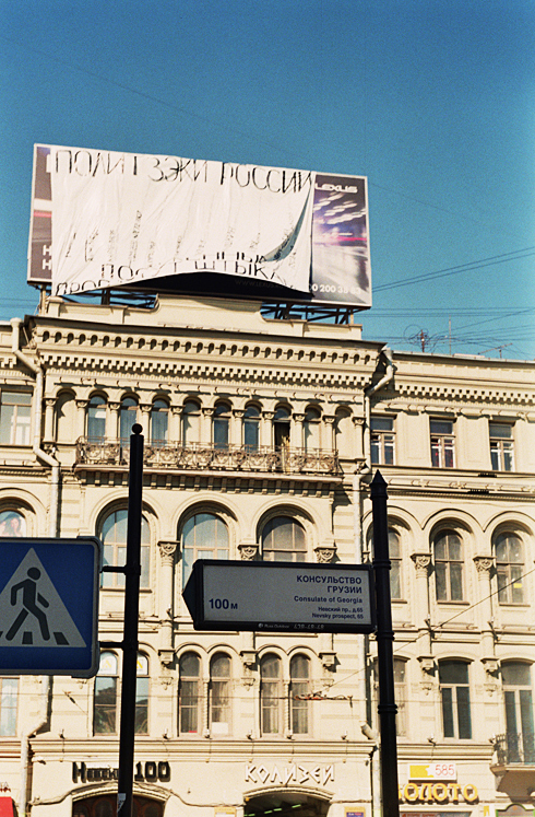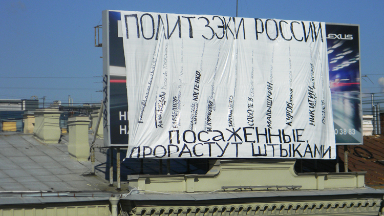 «Политзэки России. Посаженные прорастут штыками» - баннер размером 10 на 6 метров с такой надписью активисты Движения сопротивления имени Петра Алексеева вывесили на рекламном носителе, установленном на крыше дома номер 100 по Невскому проспекту (в створе улицы Марата) 18 августа 2012 года.