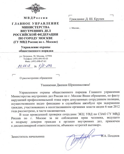 К дисциплинарной ответственности привлечена сотрудница полиции, которая после майского «Марша миллионов» в автозаке сломала объектив фотокамеры задержанной журналистки Дженни Курпен. Сегодня ранее попросившая политического убежища на Украине девушка прислала в Межрегиональную правозащитную Ассоциацию «Агора» соответствующий ответ заместителя начальника Управления охраны общественного порядка Главного управления МВД России по Москве Владимира Позднова.