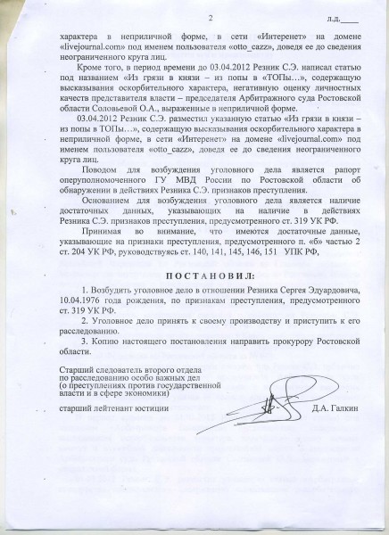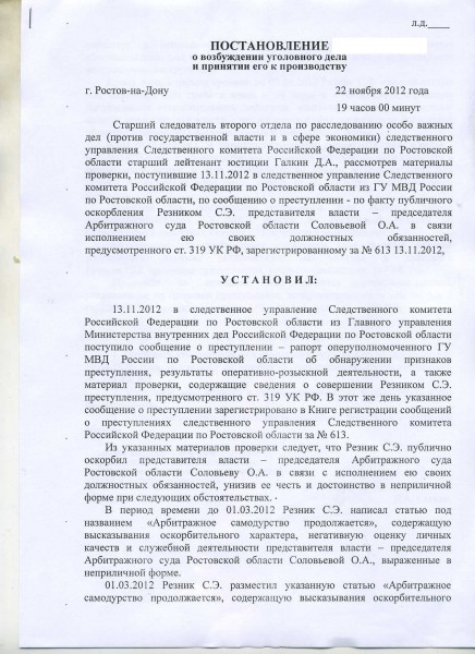 Если верить тексту постановления о возбуждении уголовного дела, то ростовский журналист и блогер Сергей Резник оскорбил честь, достоинство и профессиональные качества председателя Арбитражного суда Соловьева О.А. - причем в "неприличной оскорбительной форме".