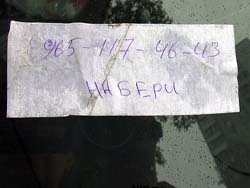 Короче, несколько дней назад какие-то негодяи сперли у меня номера. Именно, сперли, а не "свинтили" или там "открутили", позже объясню почему. А пока вернемся на стоянку, где я обнаружил свое авто без обоих госномеров, зато с бумажкой на стекле: "  965-117-46-43 НАБЕРИ". В общем, набери, заплати и жизнь снова станет прекрасной.