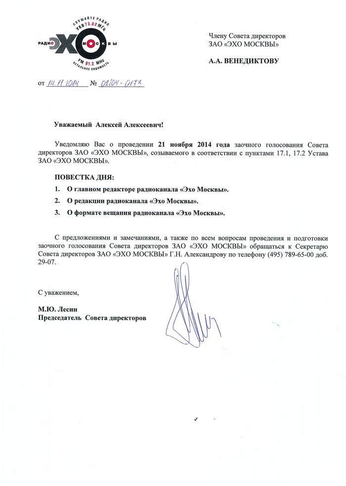 В общем, вчера часов этак с 16-ти пошла по Сети гулять и на все лады комментироваться сногсшибательная весть. О том, что председатель правления холдинга «Газпром-Медиа», он же глава Совета директоров «Эха Москвы» Михаил Лесин назначил на 21 ноября заочное голосование акционеров по трем вопросам, которые могут поставить жирный крест на 20-летней биографии радиостанции.