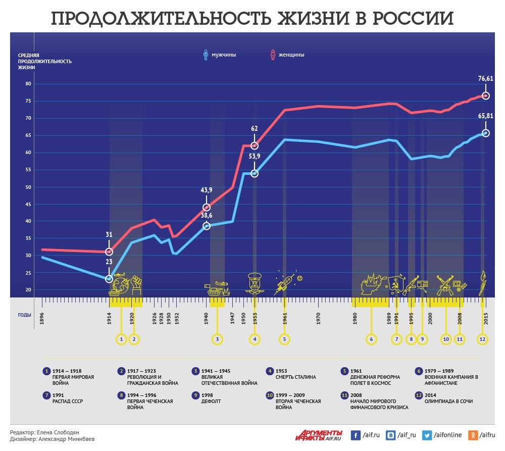 Обратите внимание, что средняя продолжительность жизни мужчин в России на 1914 год (начало Первой мировой войны и за нею - Гражданской) была всего 23 года, а уже сразу после окончания гражданской войны, где-то за 8-9 лет сразу подскочила практически до 35 лет. Как это понять, ведь в этот момент погибли миллионы человек, был голод, разруха? За счёт чего в полтора раза поднялась средняя продолжительность жизни??