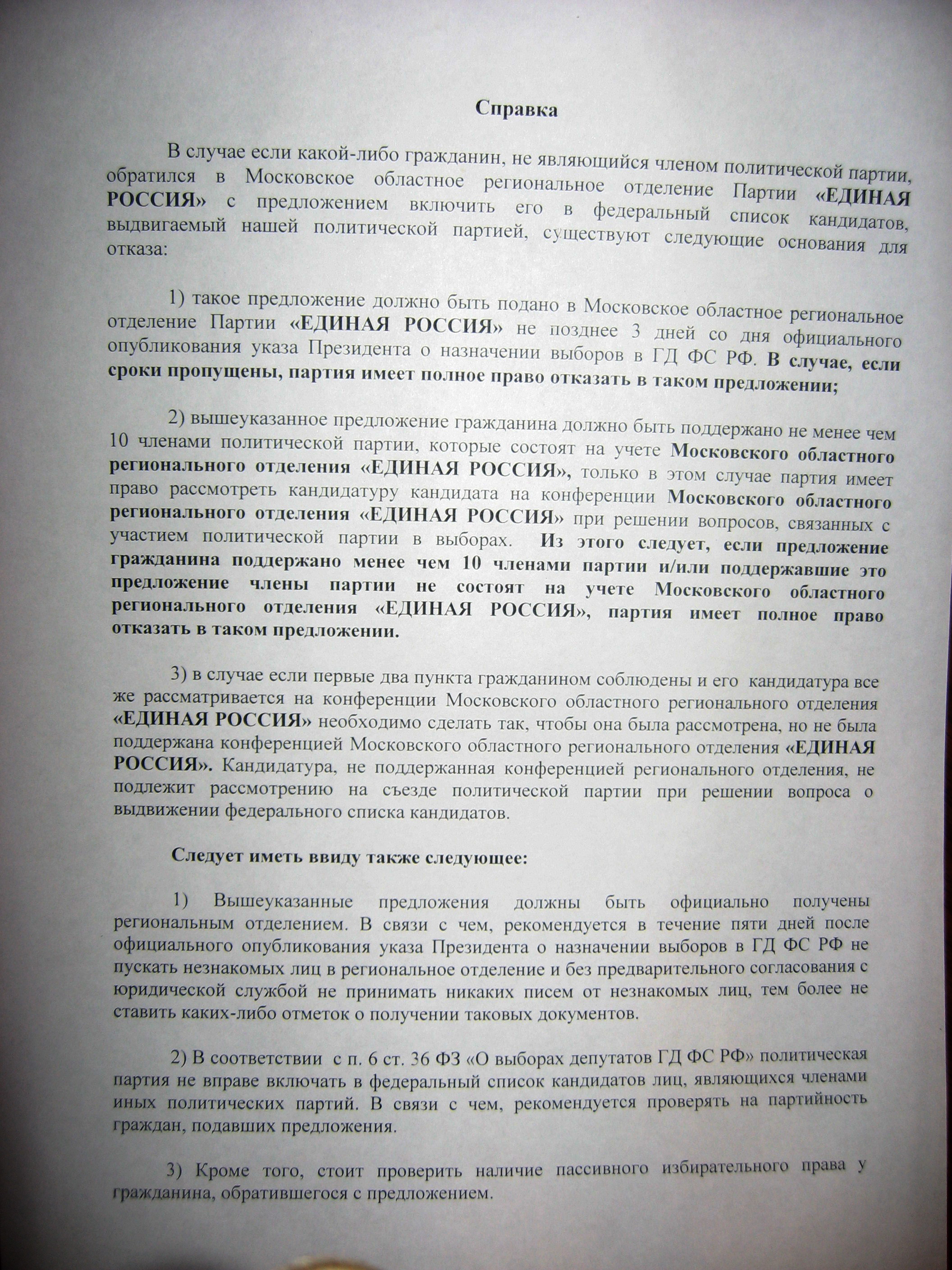 "Уважаемые коллеги здравствуйте, сегодня президент Медведев В.А. подписал указ о назначении выборов, в течении 5 дней он будет опубликован. В связи с этим в срок по 8 сентября 2011 года (включительно) всем Местным исполкомам, местным избирательным штабам запрещается принимать заявления, письма от граждан, факсы, любые почтовые сообщения и отправления, направленные посредством Почты России, иных почтовых организаций, организаций, оказывающих услуги курьерской доставки (DeL, Ponny Express и т.д.), и передавать их в Региональное отделение Партии. Отключить факс. А также не расписываться в получении никакой корреспонденции.