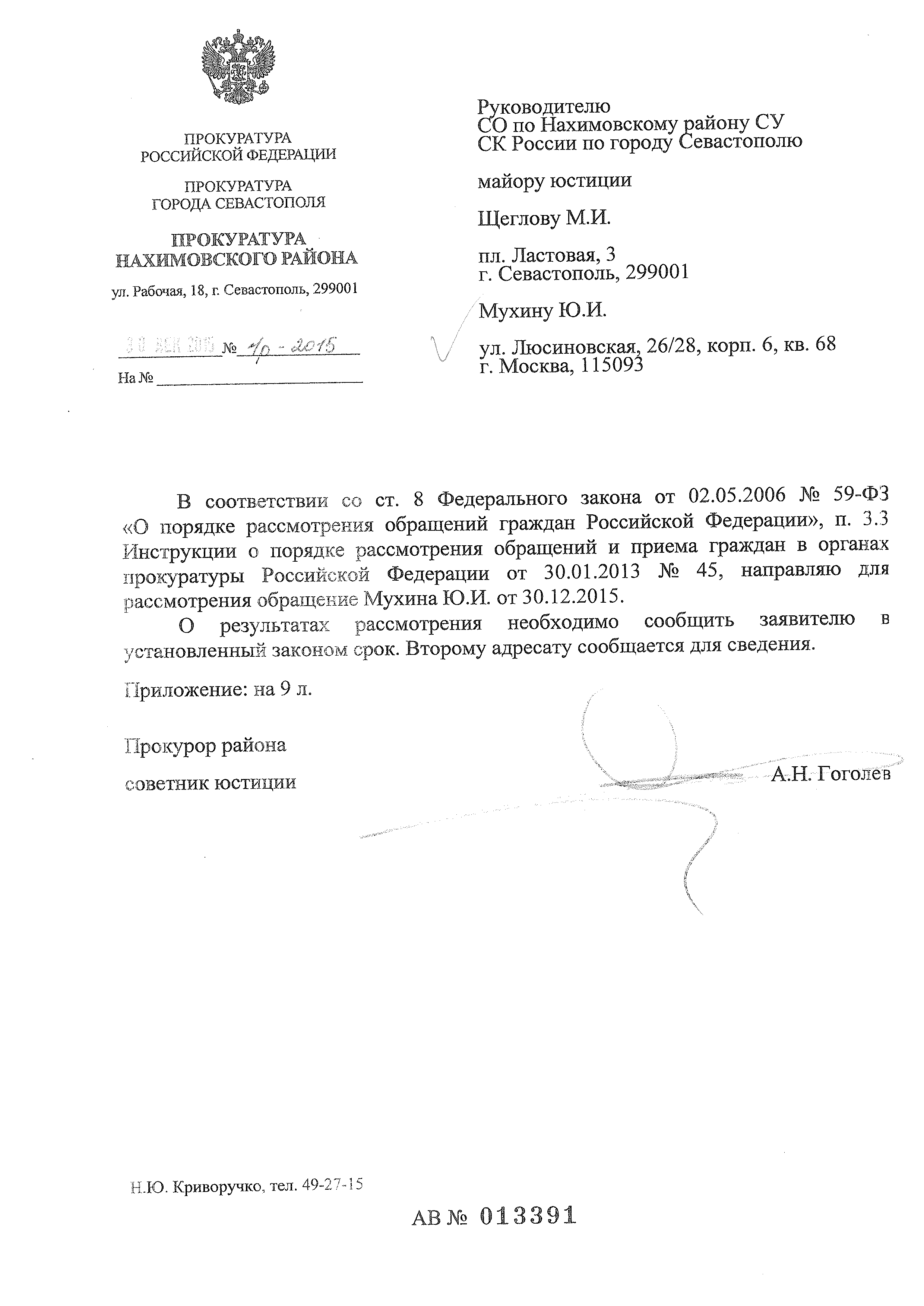 В соответствии со ст. 8 Федерального закона от 02.05.2006 № 59-ФЗ «О порядке рассмотрения обращений граждан Российской Федерации», п. 3.3 Инструкции о порядке рассмотрения обращений и приема граждан в органах прокуратуры Российской Федерации от 30.01.2013 № 45, направляю для рассмотрения обращение Мухина Ю.И. от 30.12.2015.