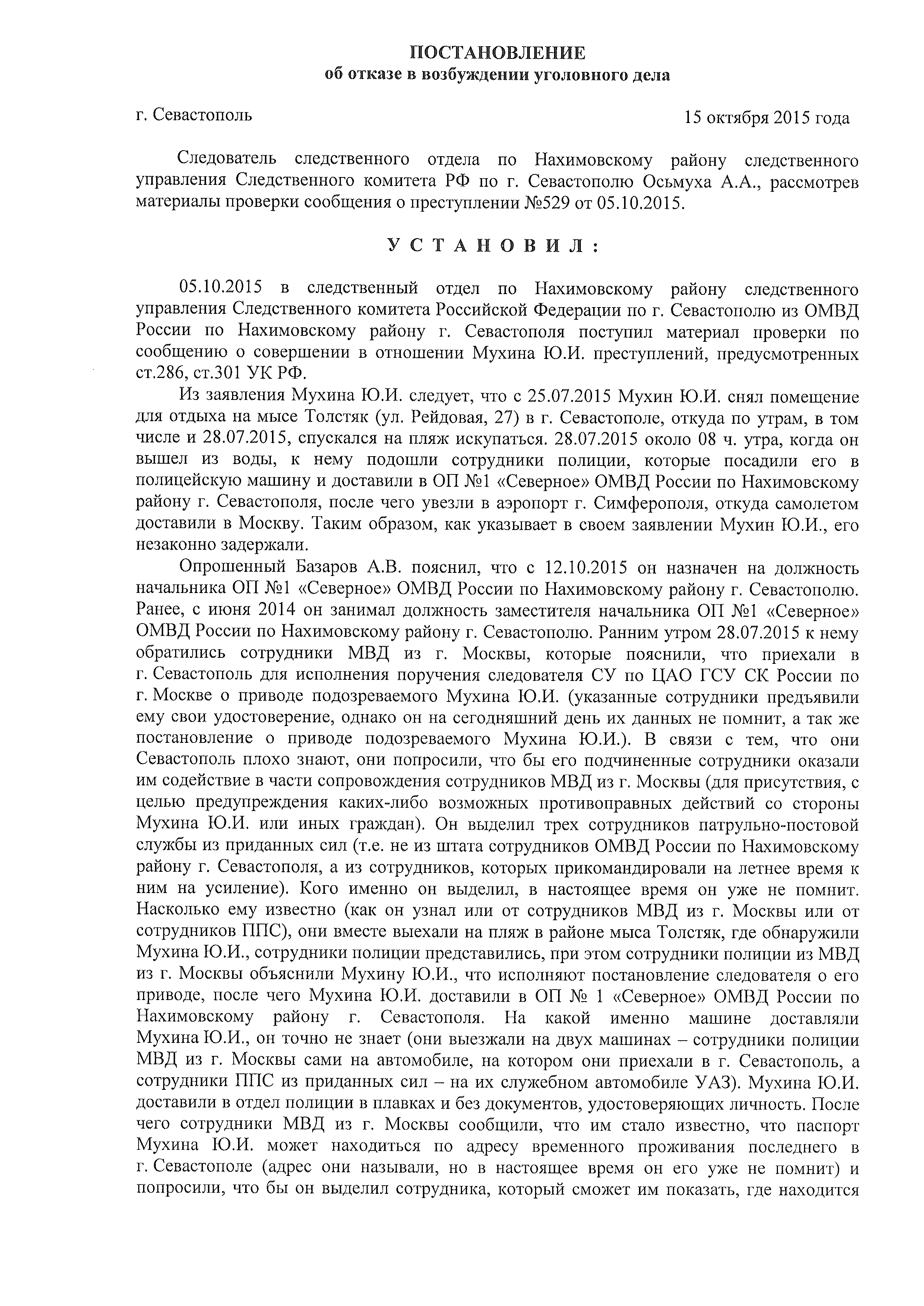 05.10.2015 в следственный отдел по Нахимовскому району следственного управления Следственного комитета Российской Федерации по г. Севастополю из ОМВД России по Нахимовскому району г. Севастополя поступил материал проверки по сообщению о совершении в отношении Мухина Ю.И. преступлений, предусмотренных ст.286, ст.301 УК РФ.