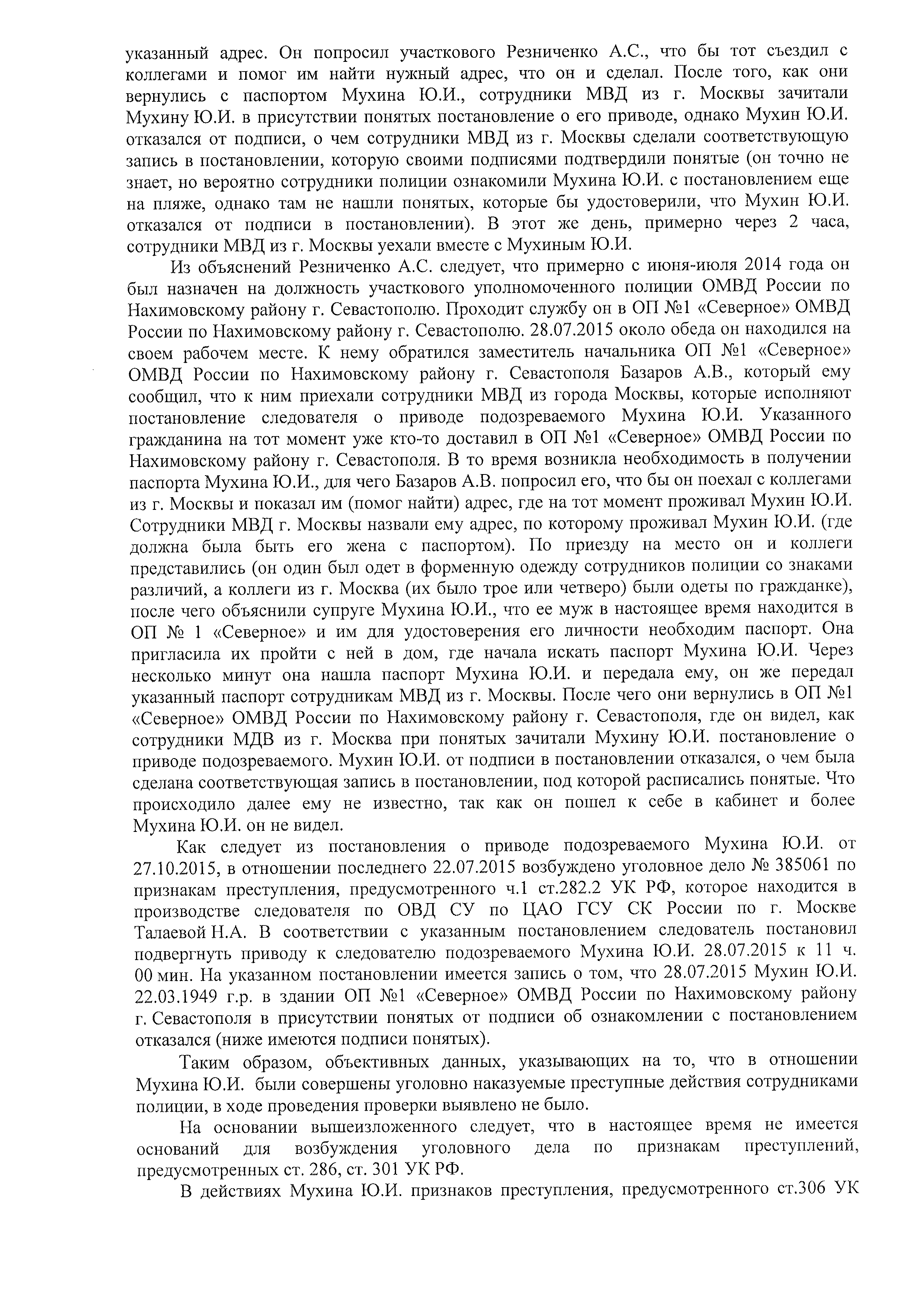 Из объяснений Резниченко А.С. следует, что примерно с июня-июля 2014 года он был назначен на должность участкового уполномоченного полиции ОМВД России по Нахимовскому району г. Севастополю. Проходит службу он в ОП №1 «Северное» ОМВД России по Нахимовскому району г. Севастополю. 28.07.2015 около обеда он находился на своем рабочем месте. К нему обратился заместитель начальника ОП №1 «Северное» ОМВД России по Нахимовскому району г. Севастополя Базаров А.В., который ему сообщил, что к ним приехали сотрудники МВД из города Москвы, которые исполняют постановление следователя о приводе подозреваемого Мухина Ю.И. Указанного гражданина на тот момент уже кто-то доставил в ОП №1 «Северное» ОМВД России по Нахимовскому району г. Севастополя. В то время возникла необходимость в получении паспорта Мухина Ю.И., для чего Базаров А.В. попросил его, что бы он поехал с коллегами из г. Москвы и показал им (помог найти) адрес, где на тот момент проживал Мухин Ю.И. Сотрудники МВД г. Москвы назвали ему адрес, по которому проживал Мухин Ю.И. (где должна была быть его жена с паспортом). По приезду на место он и коллеги представились (он один был одет в форменную одежду сотрудников полиции со знаками различий, а коллеги из г. Москва (их было трое или четверо) были одеты по гражданке), после чего объяснили супруге Мухина Ю.И., что ее муж в настоящее время находится в ОП № 1 «Северное» и им для удостоверения его личности необходим паспорт. Она пригласила их пройти с ней в дом, где начала искать паспорт Мухина Ю.И. Через несколько минут она нашла паспорт Мухина Ю.И. и передала ему, он же передал указанный паспорт сотрудникам МВД из г. Москвы. После чего они вернулись в ОП №1 «Северное» ОМВД России по Нахимовскому району г. Севастополя, где он видел, как сотрудники МДВ из г. Москва при понятых зачитали Мухину Ю.И. постановление о приводе подозреваемого. Мухин Ю.И. от подписи в постановлении отказался, о чем была сделана соответствующая запись в постановлении, под которой расписались понятые. Что происходило далее ему не известно, так как он пошел к себе в кабинет и более Мухина Ю.И. он не видел.
