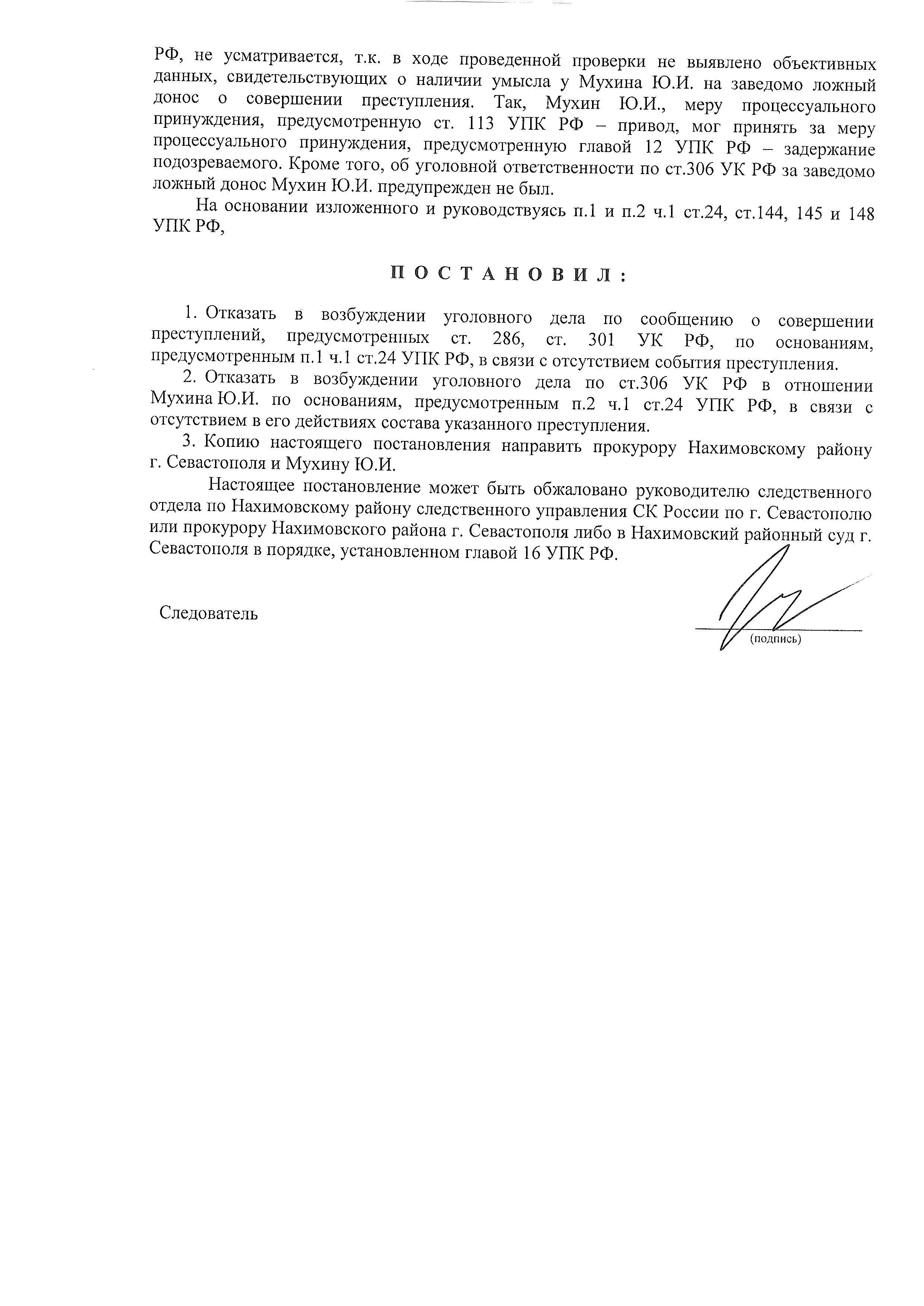 2. Отказать в возбуждении уголовного дела по ст.306 УК РФ в отношении Мухина Ю.И. по основаниям, предусмотренным п.2 ч.1 ст.24 УПК РФ, в связи с отсутствием в его действиях состава указанного преступления.