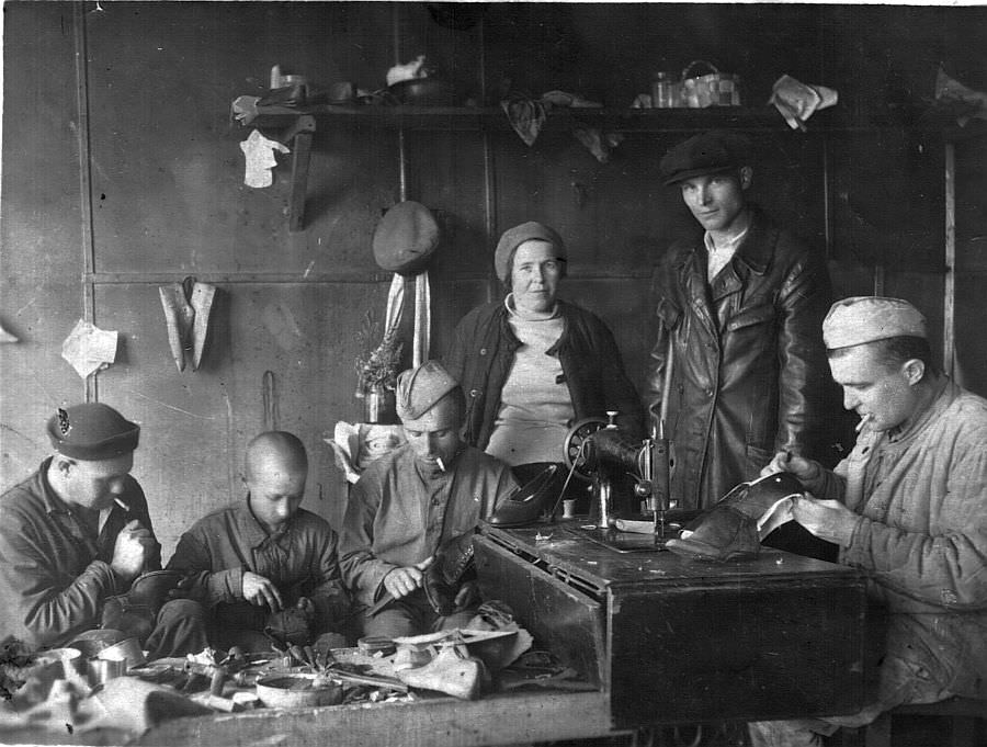 К этому снимку из Интернета подпись: «Артель инвалидов войны в городе Молотовске (ныне Северодвинске Архангельской области). В центре — мастер сапожного цеха М.Т. Зобова. Забота о семьях фронтовиков и инвалидах войны была одной из важнейших для горисполкома Молотовска. На заседаниях горисполкома вопросы помощи семьям фронтовиков и инвалидам рассматривались 121 раз: обеспечение жилой площадью, материальная, денежная помощь, питание, снабжение дровами. В феврале 1942 года была создана артель инвалидов с производствами сапожным, швейным, галантерейным и металлическим. С января 1943 года по июль 1946 года в город прибыли 756 инвалидов войны, из них 9 человек — инвалиды первой группы, 145 — второй. Трудоустроено — 156 человек, предоставлено жилье — девяноста семи. Отделом соцобеспечения с 1941 по 1945 годы инвалидам войны было выплачено пенсий и пособий на сумму 1 874 912 рублей». Я видел именно таких инвалидов, но, правда, они были уже в гражданской одежде.