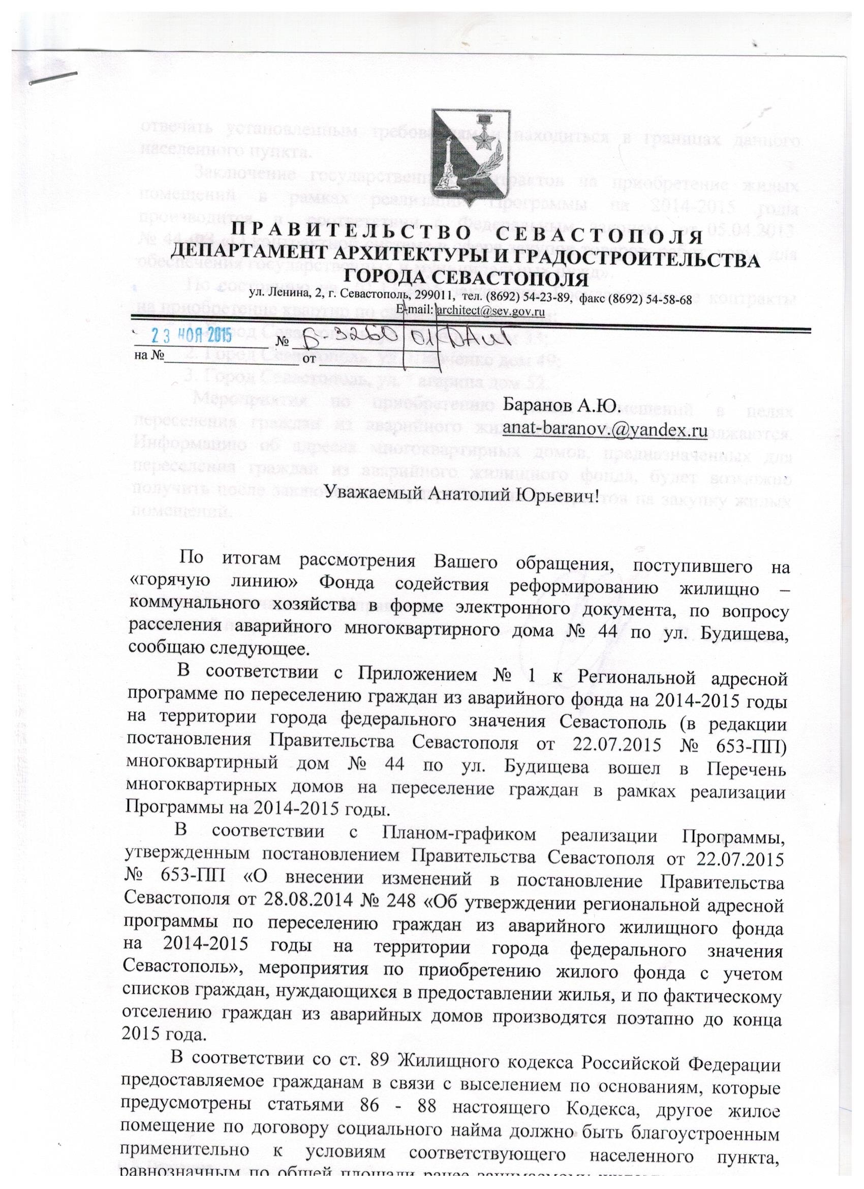 Ну а ответа из Севастопольской администрации мы с г-ном Руриным так и не дождались, и пришлось мне писать новое письмо, более раздраженное, что, мол, остался месяц до окончания моего переселения, а оно даже никак не начиналось. И хотелось бы внятного ответа. Зарегистрировано оно 25.10.2015 в 02:08 за номером 1505/15.