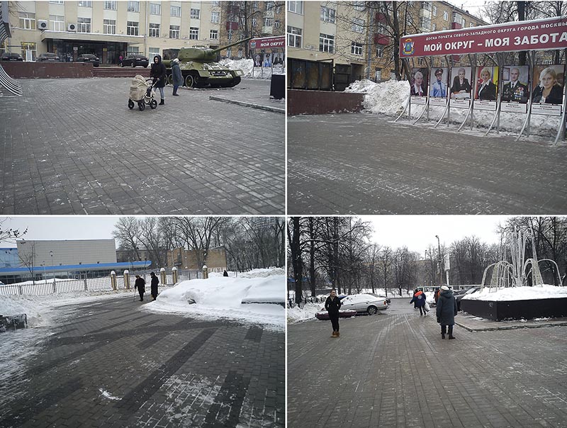 Если перевести этот безграмотный кошмар на русский язык, получается, что у префектуры сейчас ремонт и вообще черт ногу сломит. Однако если посмотреть на фотографии означенного места, которые я сделала сегодня, никакого ремонта и вообще ничего опасного, кроме старого танка, там не наблюдается. Гуляют мамаши, пенсионеры, на них с Доски почета ласково смотрят лучшие люди района, все тихо и спокойно. Мистика, да и только!