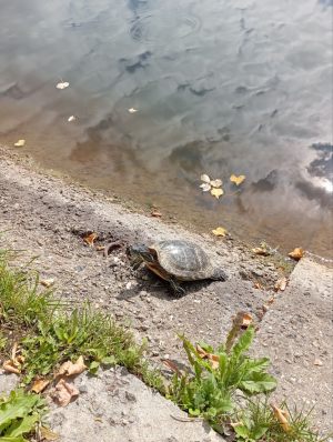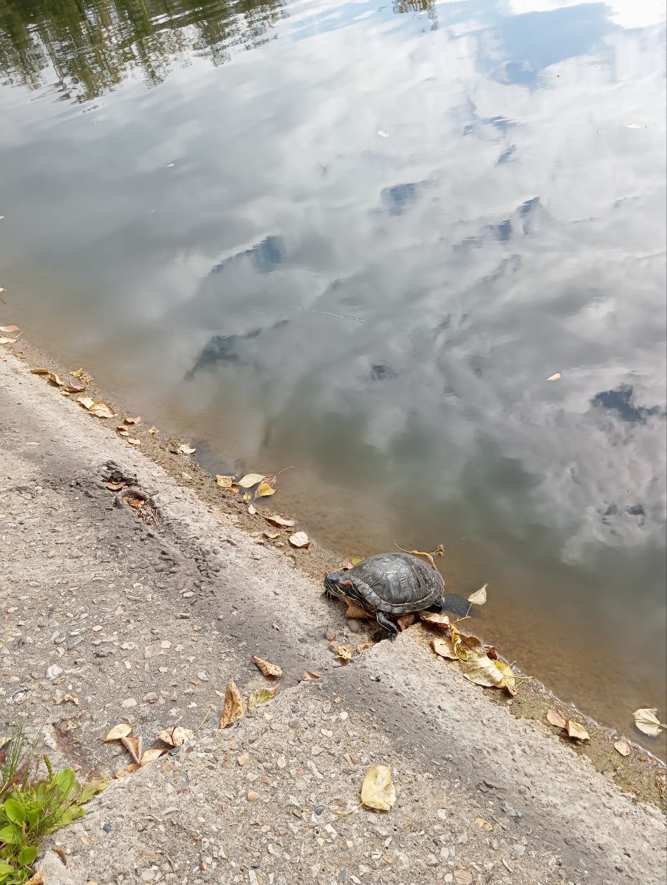 Правда потомства пока не видел, тем более, что эти две черепах относятся к разным видам: одна красноухая, из других широт родом, явно выпущенная кем-то из аквариума, а вторая - зеленая болотная, вполне могла мигрировать естественным путем.
